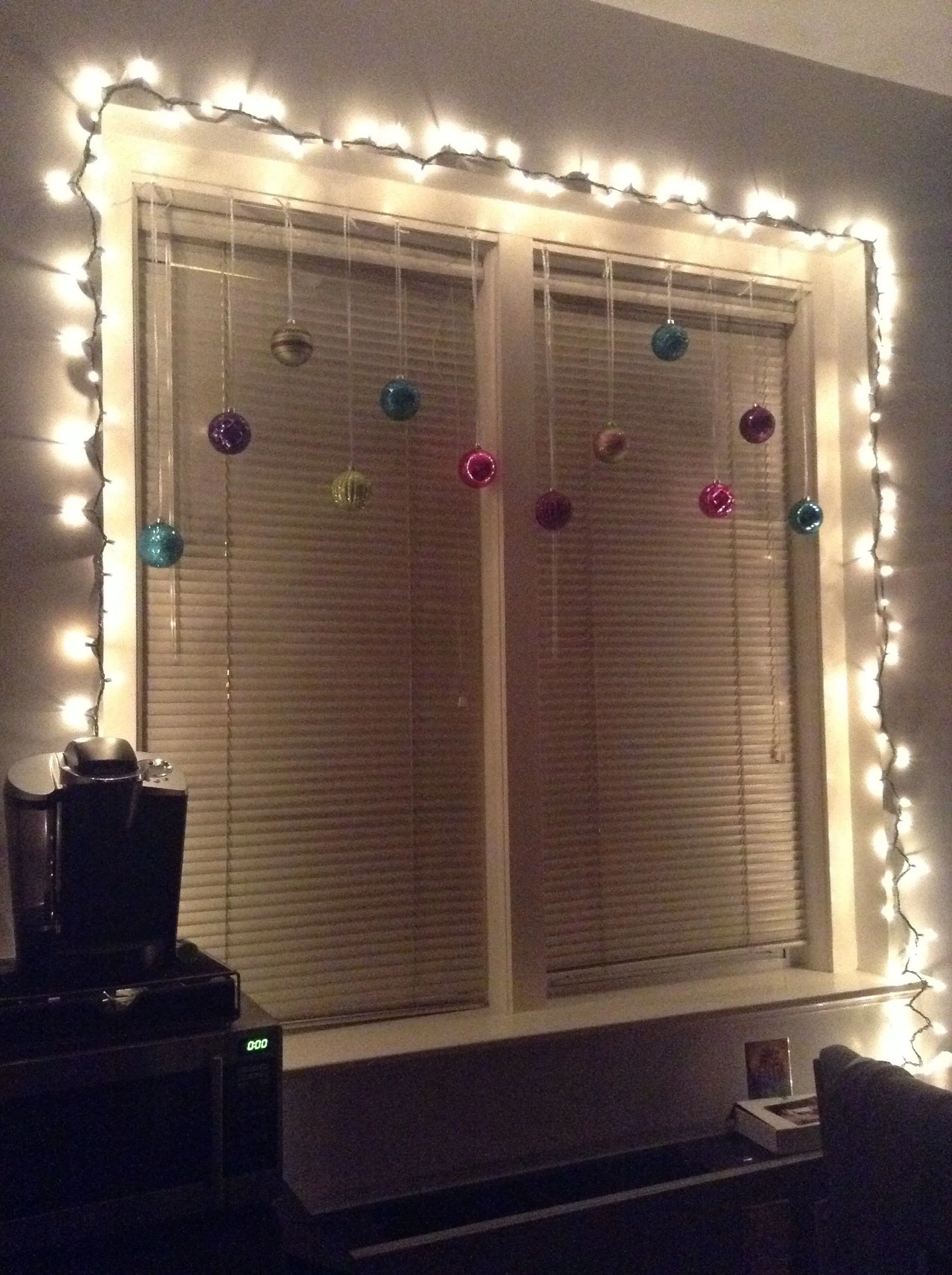 Now for some window decor. A simple idea you can use is to hang ornaments from the top of your window. Be sure to hang your ornaments at varying heights like in the example photo to achieve a well balanced look. Complement your bulbs by adding Christmas lights all around your window.