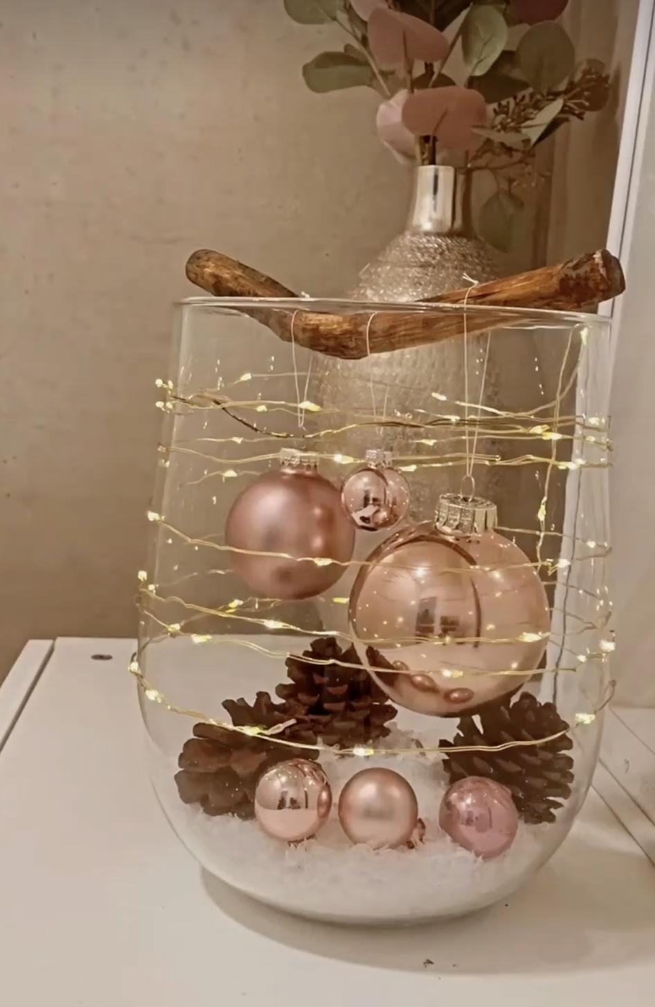 Next is a simple DIY project that makes for a gorgeous decoration in your dorm room. For this project, gather a clear/glass jar or vase and fill it with all sorts of holiday decor pieces. You can use anything from ornaments, pinecones, fairy lights, garland, and more.