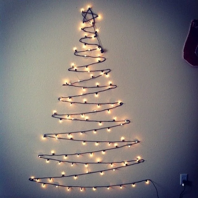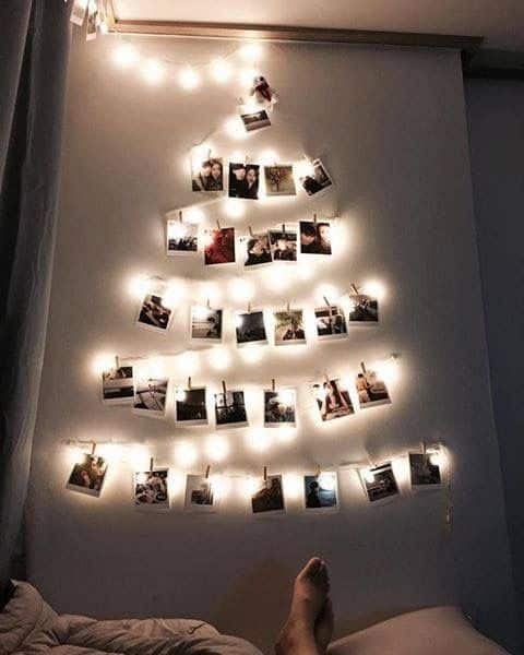 This one is similar to the polaroid tree idea, but this time without the polaroids. Take your fairy lights or string lights and shape them to make a Christmas tree with a little star on top.