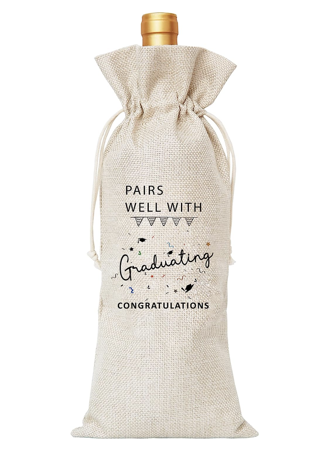 Shopping for a wine lover? Slip the bottle into this super pretty graduation themed bag for an extra celebratory touch. There’s also a master’s degree-themed one for recent ex-graduate students!