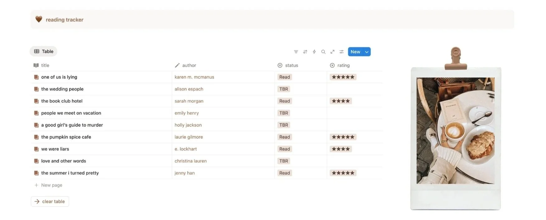 And here’s our reading tracker! You’ve got columns for title, author, status (read or TBR), and rating. To choose your status, simply click on the box and select from the option. If you start typing, you can also add a new status from here. Click “clear table” below the tracker to clear it.