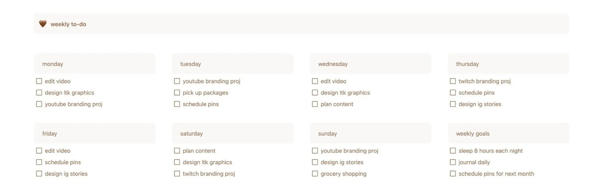 Here’s where you’ll keep your to-do list for each day of the week. To add a new box to a day, place your cursor at the end of a line and press enter. There’s also a spot for you to add some goals you have for the week.