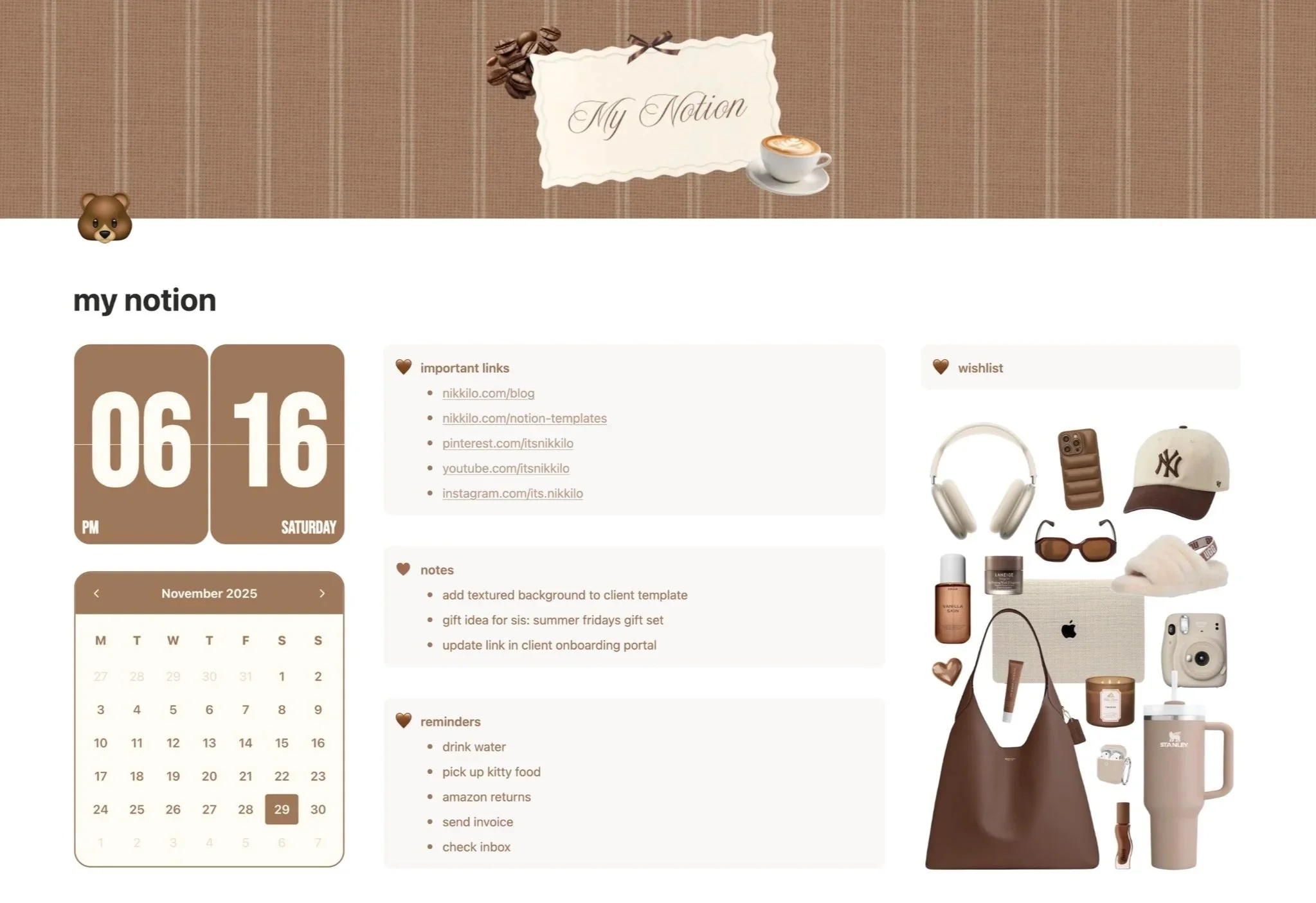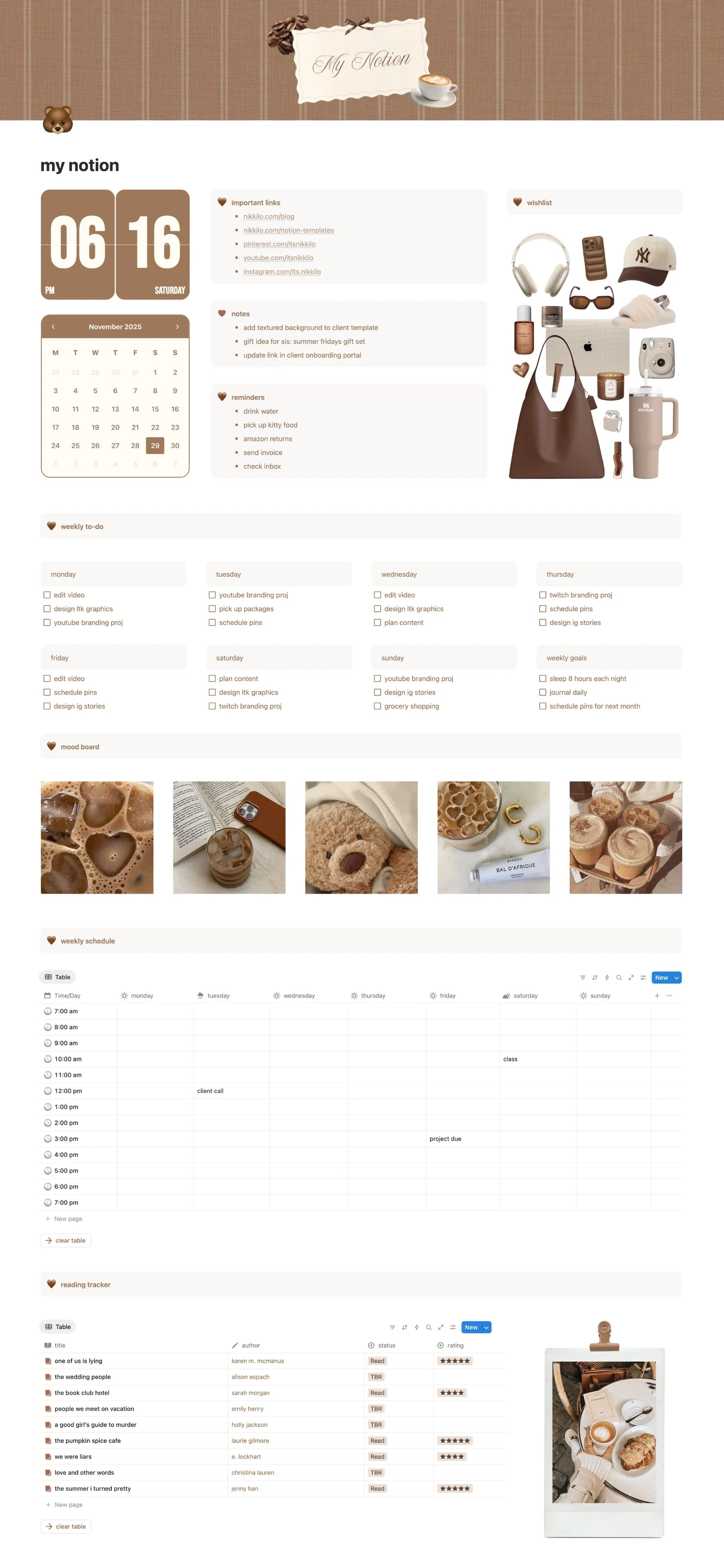 So, here’s an overview of what this Notion template looks like. As you can see, I went for the cutest, coziest brown theme this time.
