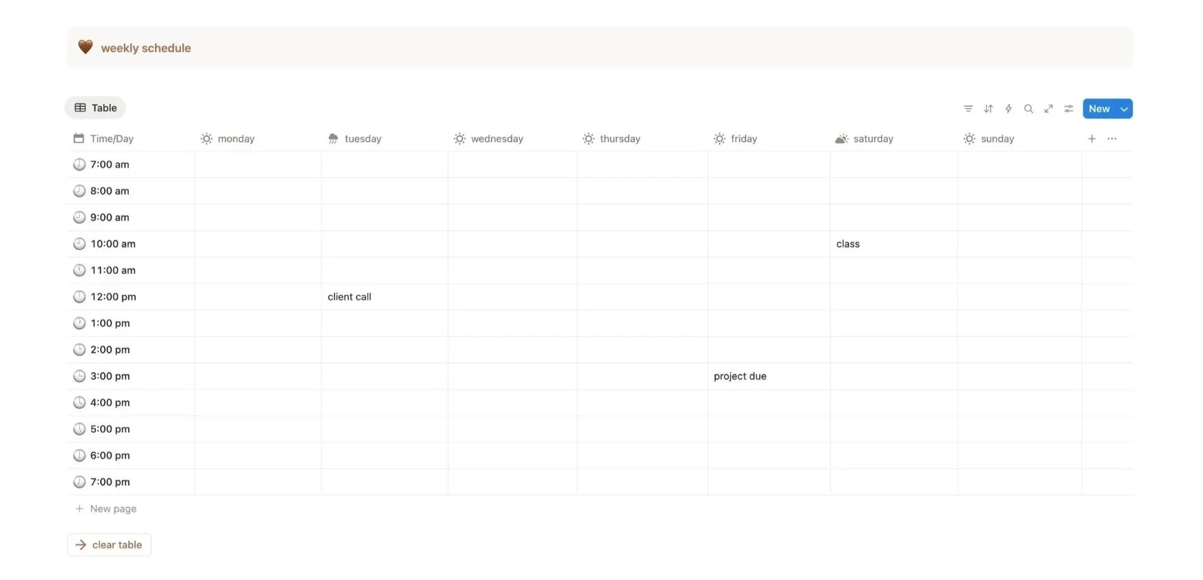 Feel free to change the times or time increments (for example, having boxes for every half hour instead of every hour). You can also add more boxes by mousing over each row and clicking the plus icon all the way on the left.