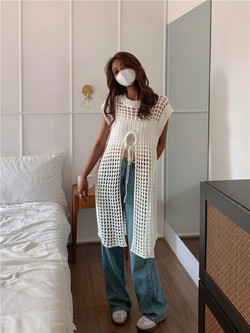 For a casual and insanely Pinterest-worthy outfit, try styling a long crochet cover up top with some jeans and sneakers. This look is perfect for days that aren’t too hot or too cold, when you need a cozy yet breathable outfit.