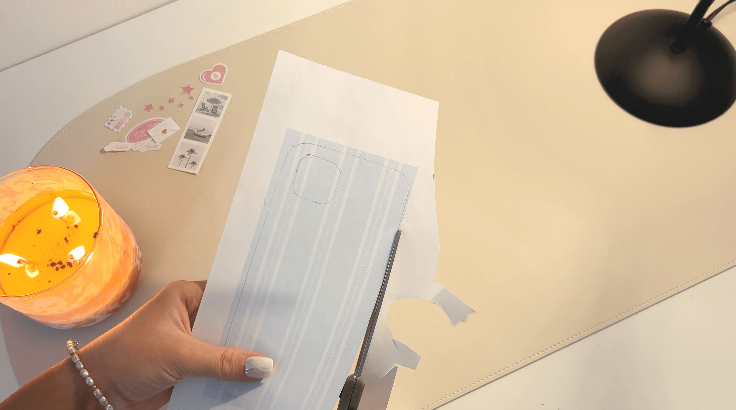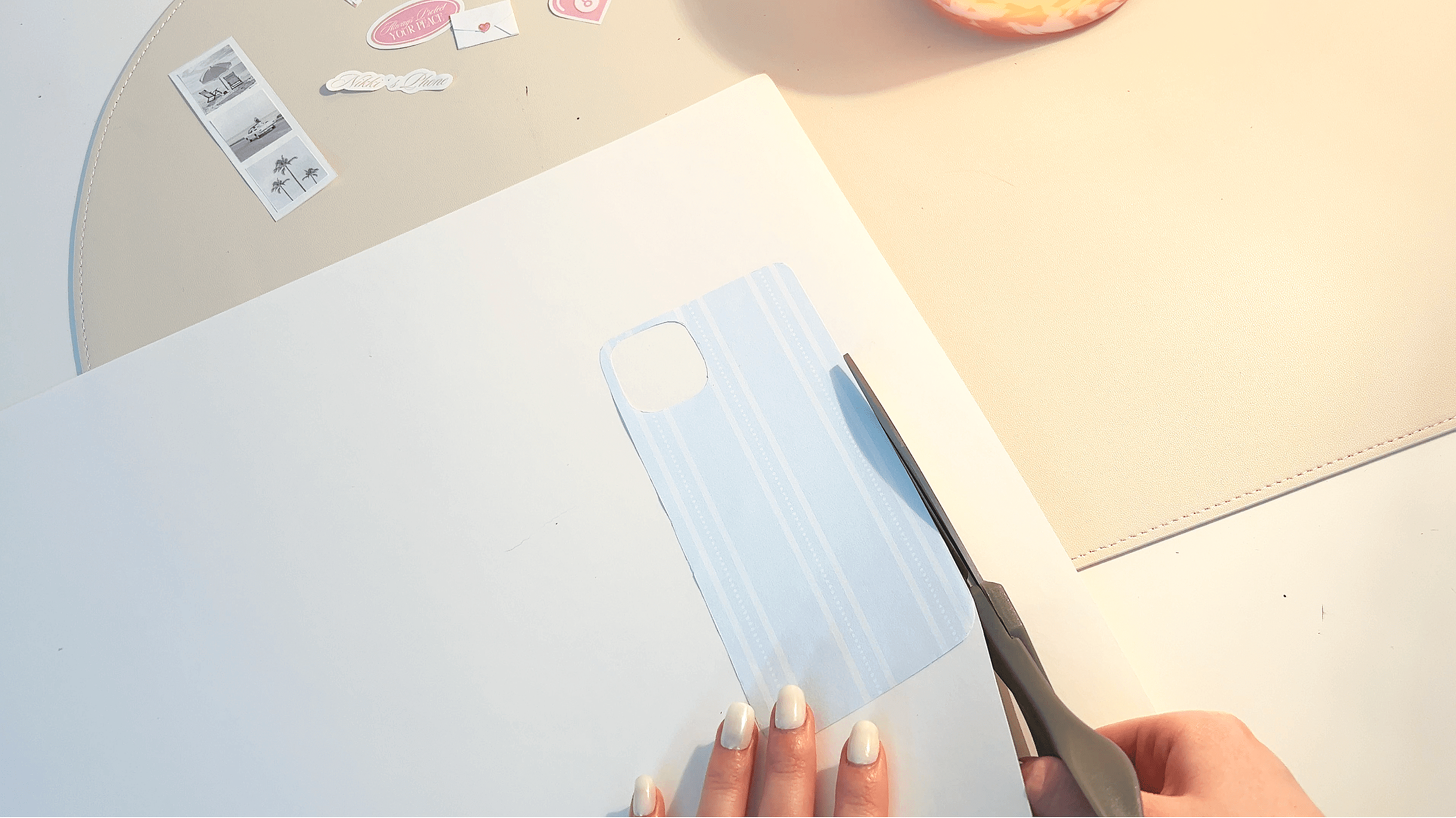 Place your clear case on top of the background design and use a pencil to trace around it as well as on the inside of the camera area. Then cut it out.