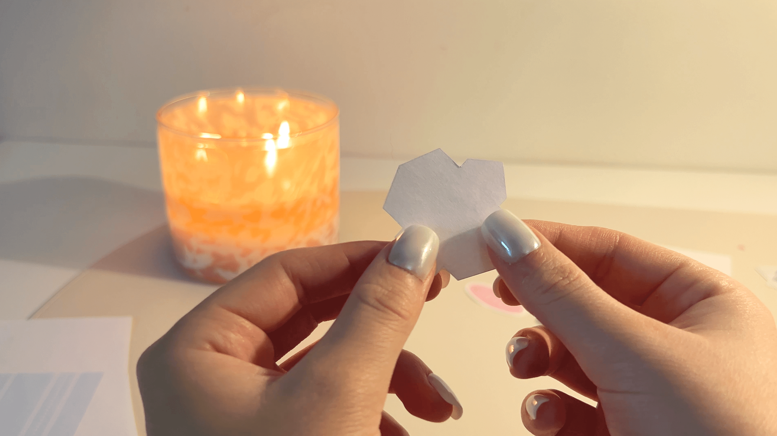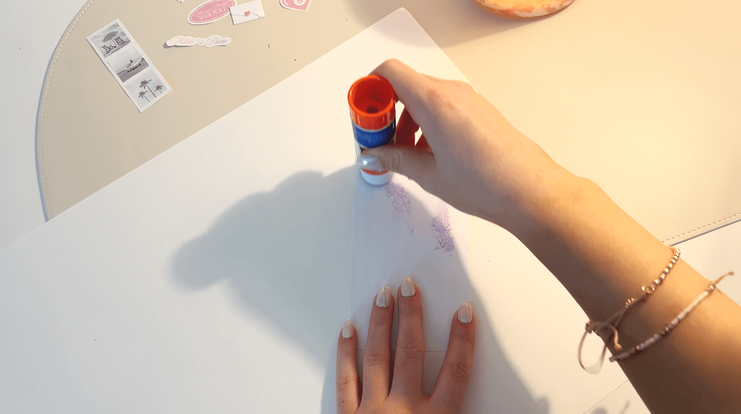 Glue together any elements that require it: the polaroid strip, heart magic eight ball, envelope/heart seal, and postcard.