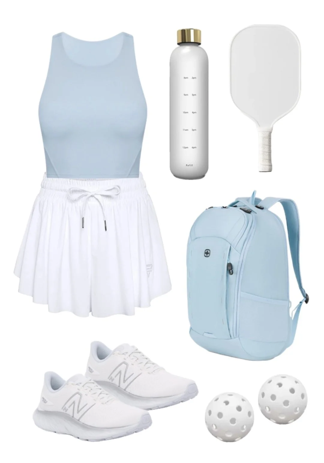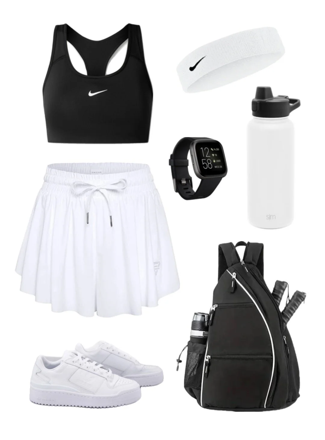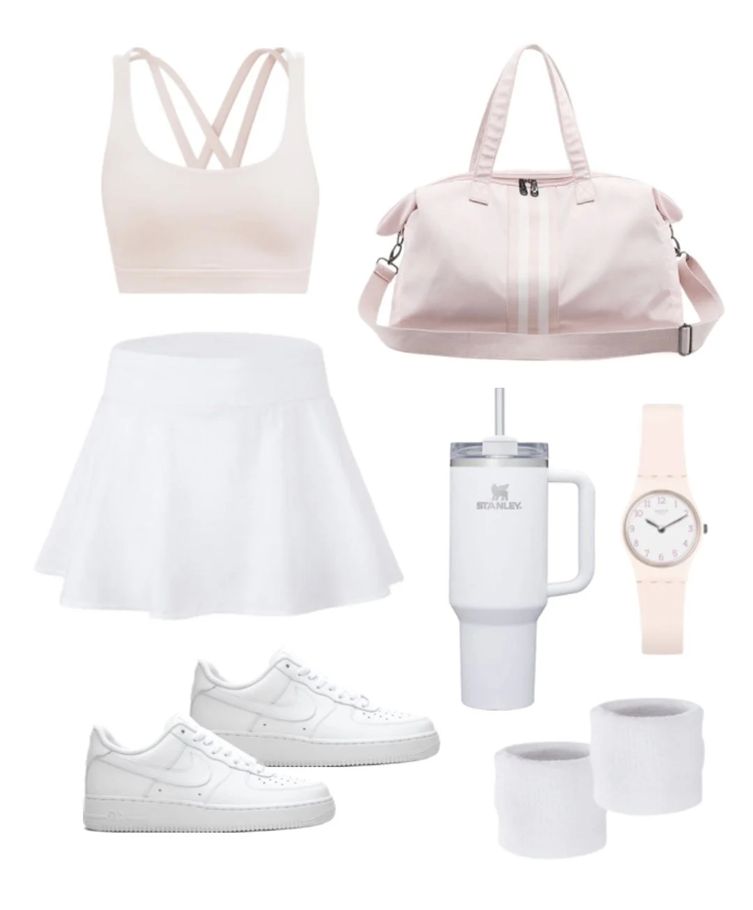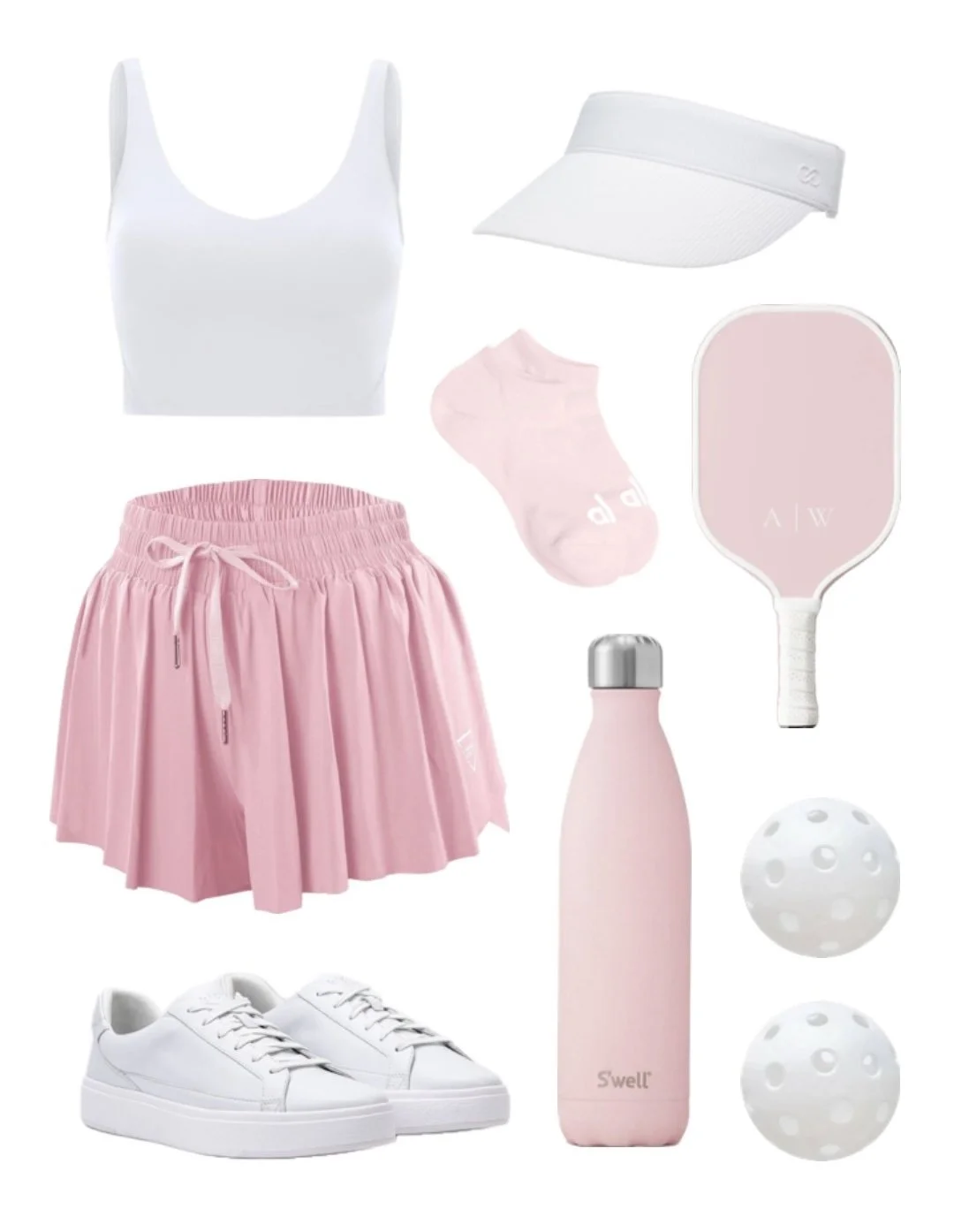 Moving right along in my list of pickleball outfits is one that’s perfect for any and all pink lovers! We have an adorable strappy back pink sports bra paired with a pretty white skirt for a girly and athletic aesthetic. I’ve also included some pretty accessories for inspiration including a gym bag to hold paddles and balls.