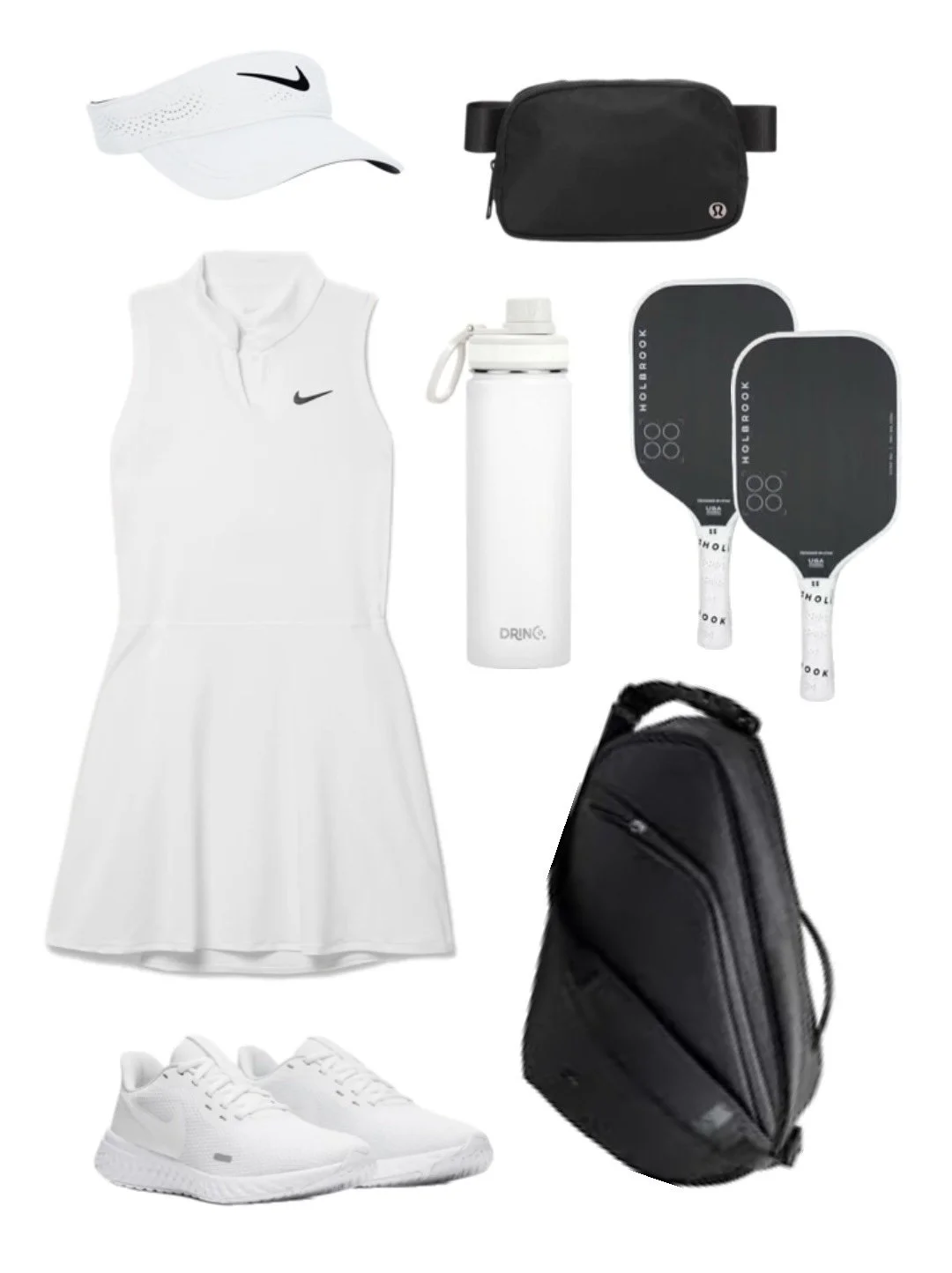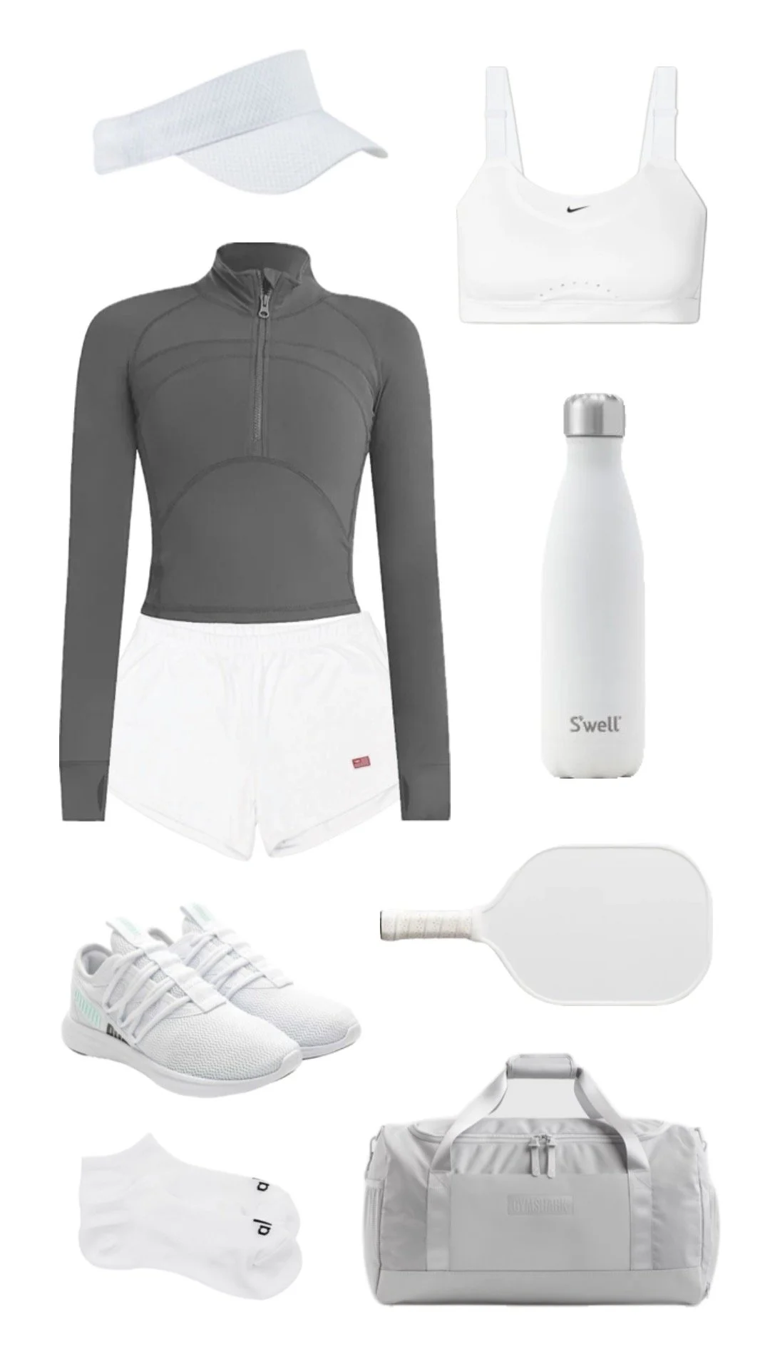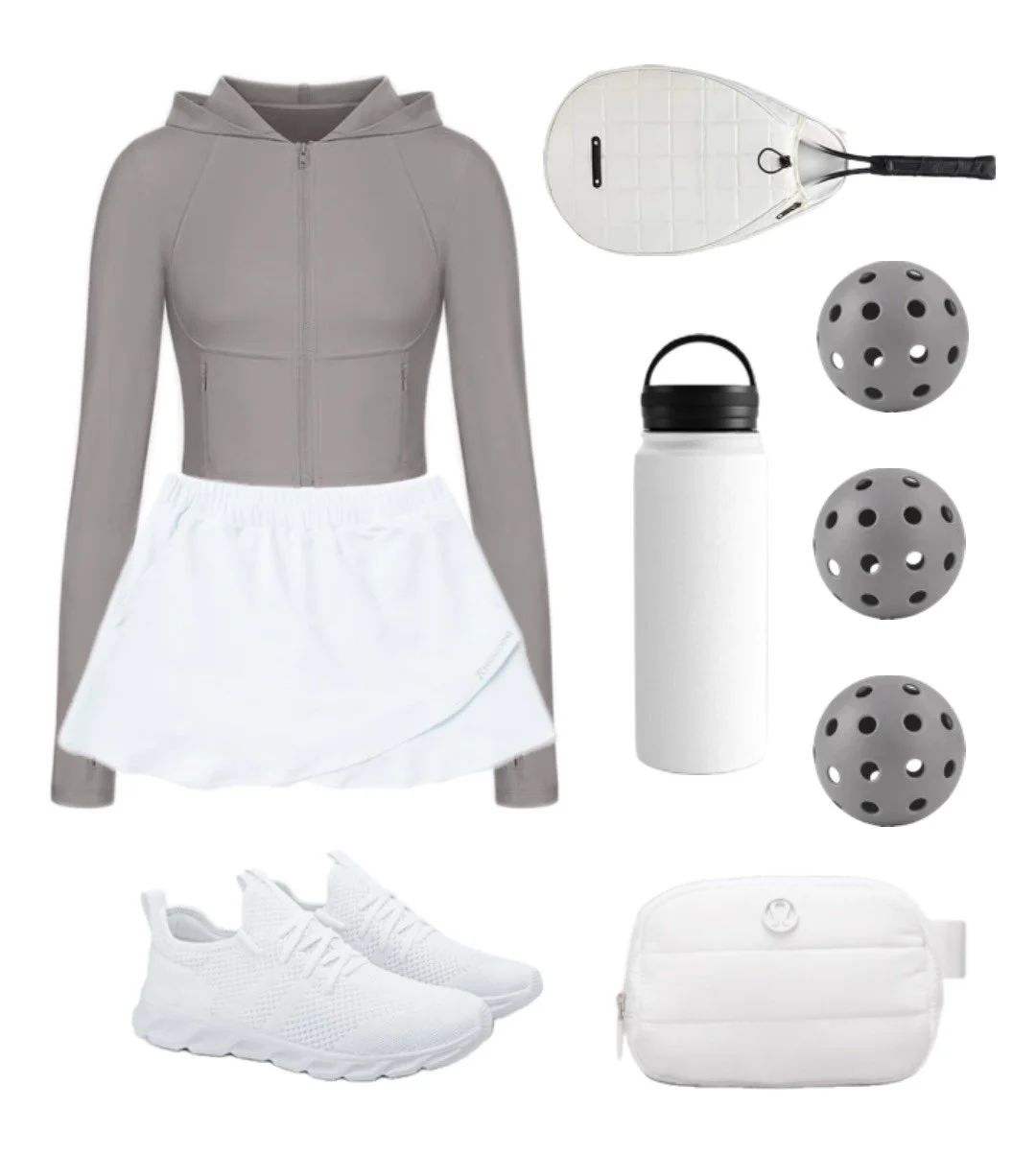 Jacket fans, I have one more outfit for you. This gorgeous grey zip-up hoodie pairs perfectly with a white tennis skirt and sneakers. To match the light tones, gather some cute yet functional accessories like a fanny pack, water bottle, and even a matching pickleball paddle case.