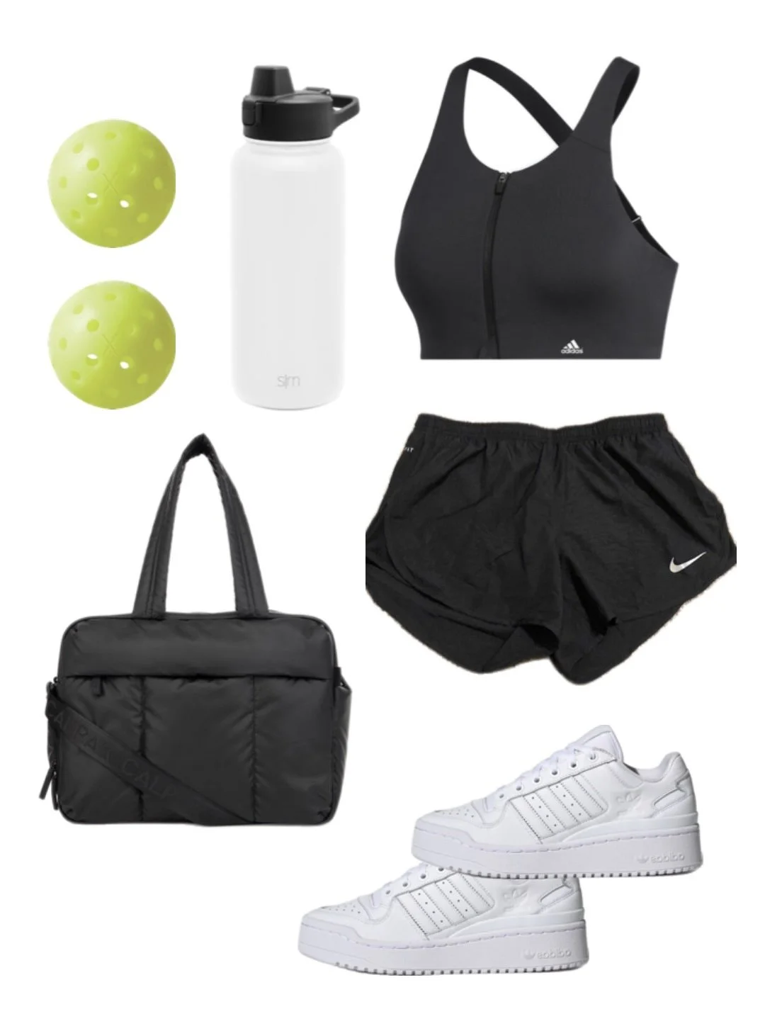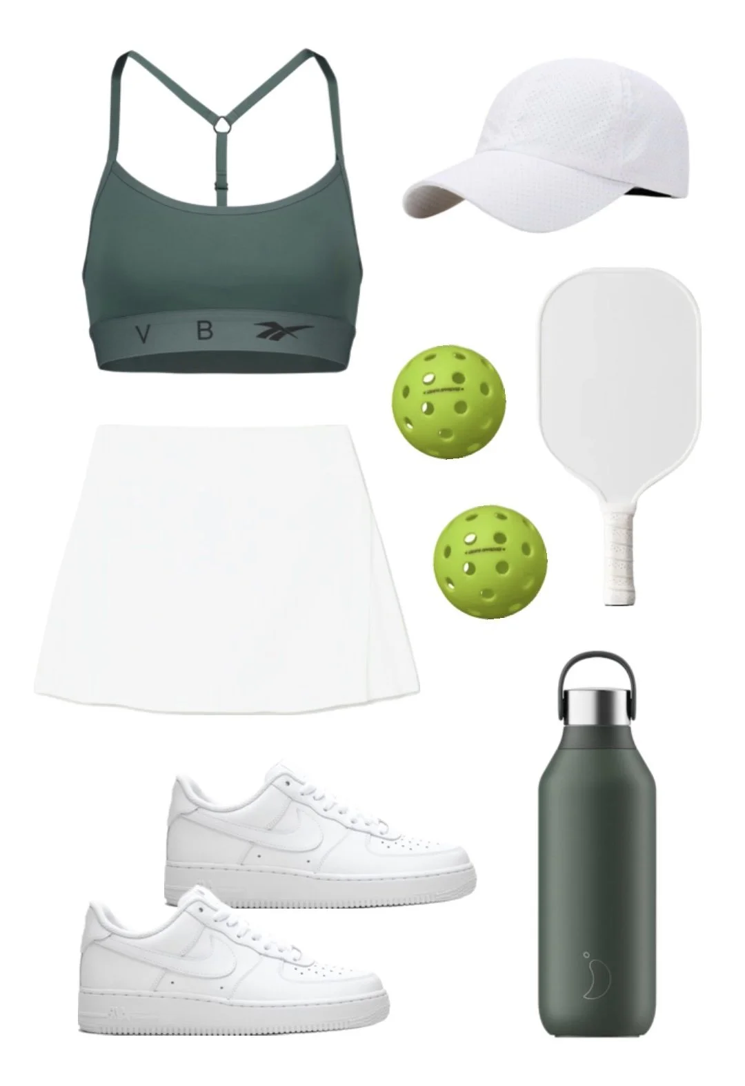 For some helpful accessories, you’ll want to wear a quality sports bra and a visor if it’s sunny out! And of course, a pickleball paddle to match your outfit is a must.